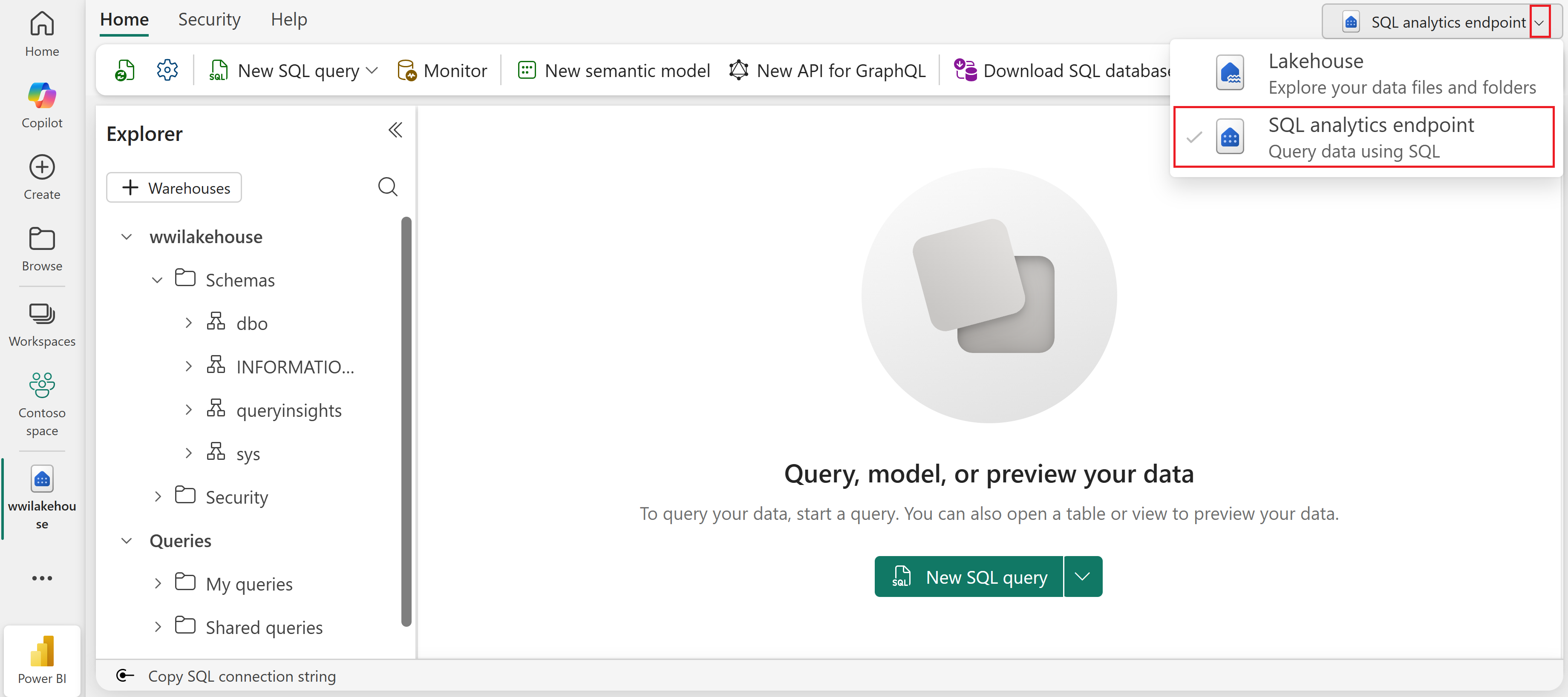 - Fra Lakehouse Explorer — I øverste højre område af båndet bruger du dropdown-menuen til at skifte til SQL analytics endpoint-visningen.