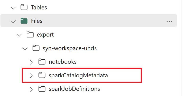 // Azure Synapse workspace config var SynapseWorkspaceName = "<synapse_workspace_name>" var DatabaseNames = "<db1_name>;<db2_name>" var SkipExportTablesWithUnrecognizedType:Boolean = false // Fabric config var WorkspaceId = "<workspace_id>" var LakehouseId = "<lakehouse_id>" var ExportFolderName = f"export/${SynapseWorkspaceName}/sparkCatalogMetadata" var OutputFolder = f"abfss://${WorkspaceId}@onelake.dfs.fabric.microsoft.com/${LakehouseId}/Files/${ExportFolderName}/"1.3) Kør alle notesbøger for at eksportere katalogobjekter til OneLake. Når cellerne er fuldført, oprettes denne mappestruktur under den mellemliggende outputmappe.