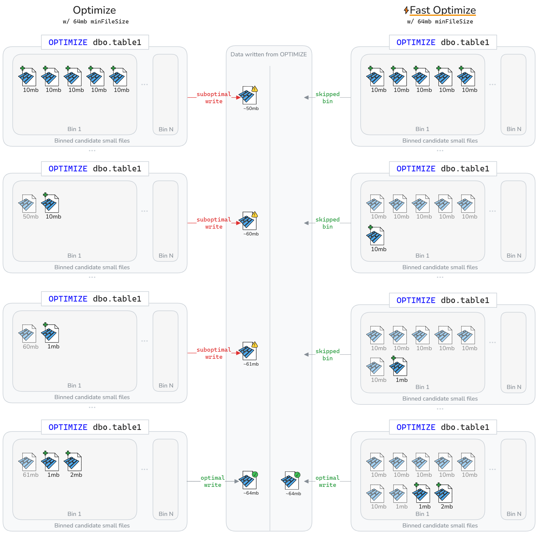 Hurtig optimering kan reducere omskrevne data over en Delta-tabels livscyklus. Som vist i det følgende diagram, springer hurtig optimering suboptimale bins over, hvilket resulterer i hurtigere og mere idempotente OPTIMIZE jobs med mindre skriveforstærkning.