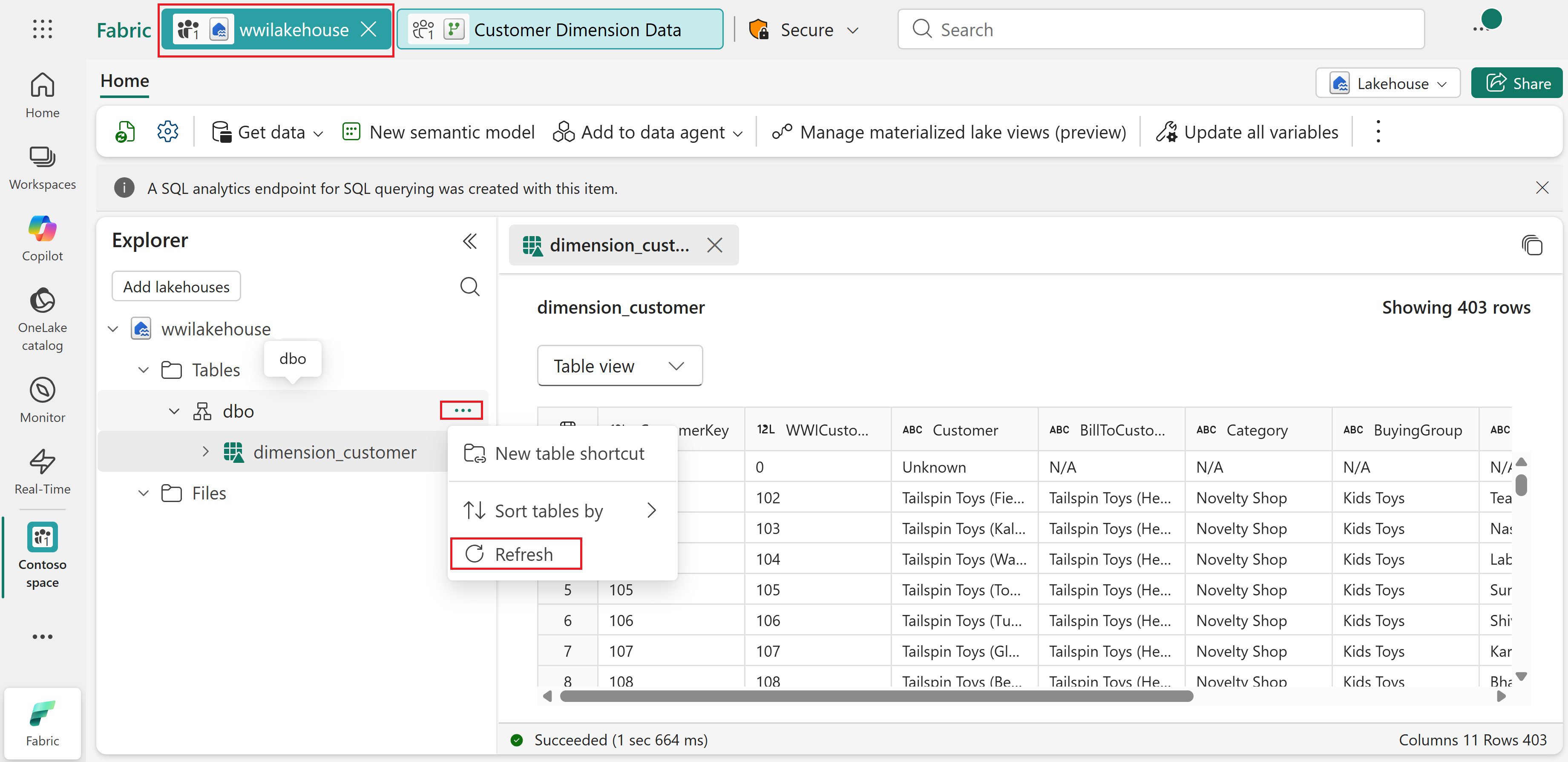 Når opdateringen er færdig, udvid DBO-skemaet for at se dimension_customer Delta-tabellen. Vælg tabellen for at få vist dataene.