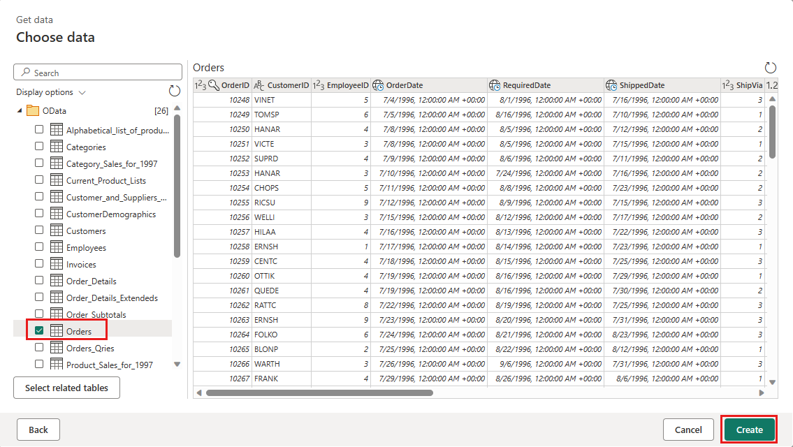 Vælg tabellen Orders, og vælg Næste.