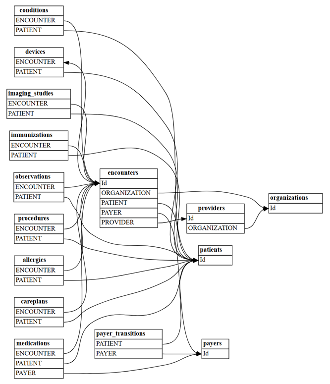 all_tables = { "allergies": pd.read_csv('synthea/csv/allergies.csv'), "careplans": pd.read_csv('synthea/csv/careplans.csv'), "conditions": pd.read_csv('synthea/csv/conditions.csv'), "devices": pd.read_csv('synthea/csv/devices.csv'), "encounters": pd.read_csv('synthea/csv/encounters.csv'), "imaging_studies": pd.read_csv('synthea/csv/imaging_studies.csv'), "immunizations": pd.read_csv('synthea/csv/immunizations.csv'), "medications": pd.read_csv('synthea/csv/medications.csv'), "observations": pd.read_csv('synthea/csv/observations.csv'), "organizations": pd.read_csv('synthea/csv/organizations.csv'), "patients": pd.read_csv('synthea/csv/patients.csv'), "payer_transitions": pd.read_csv('synthea/csv/payer_transitions.csv'), "payers": pd.read_csv('synthea/csv/payers.csv'), "procedures": pd.read_csv('synthea/csv/procedures.csv'), "providers": pd.read_csv('synthea/csv/providers.csv'), "supplies": pd.read_csv('synthea/csv/supplies.csv'), }Find relationer mellem tabellerne ved hjælp af SemPys