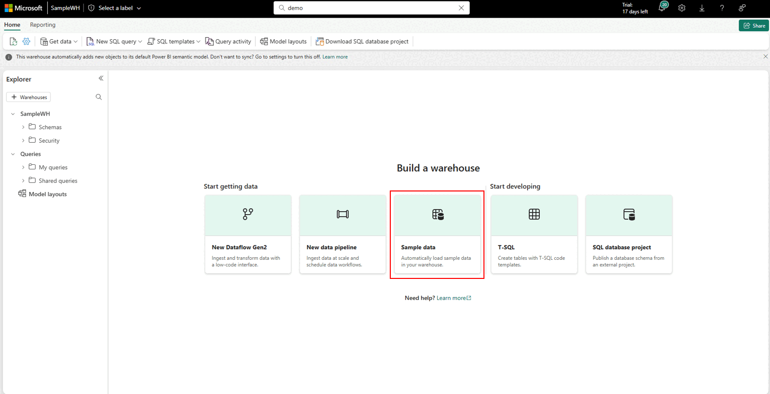 Når indlæsningen af eksempeldata er fuldført, åbnes lageret med data, der er indlæst i tabeller og visninger for at forespørge.