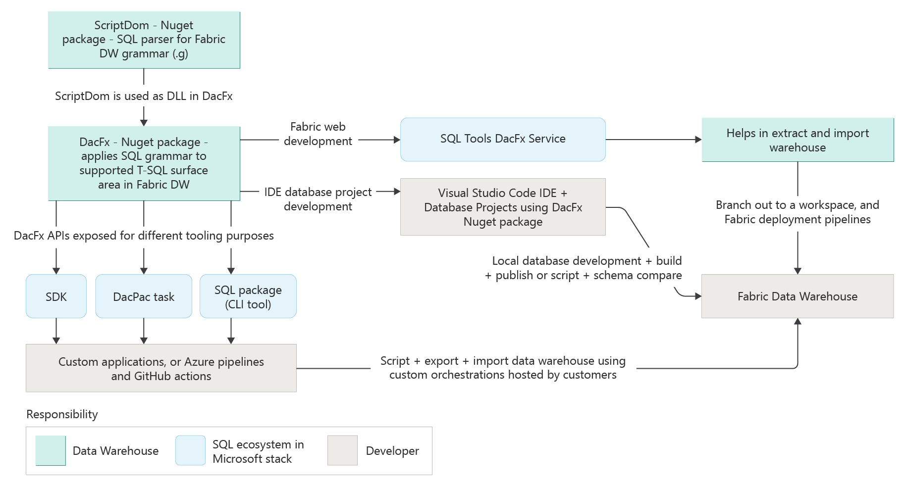 Denne artikel indeholder en oversigt på højt niveau over de arbejdsprocesser for udvikling og udrulning, der er tilgængelige for udviklere, der arbejder med Fabric Data Warehouse, uanset om du bygger i Fabric-webeditoren, arbejder lokalt i et integreret udviklingsmiljø (IDE), udruller via Fabrics oprindelige udrulningspipelines eller integrerer med CI/CD-pipelines i Azure DevOps Services eller GitHub.