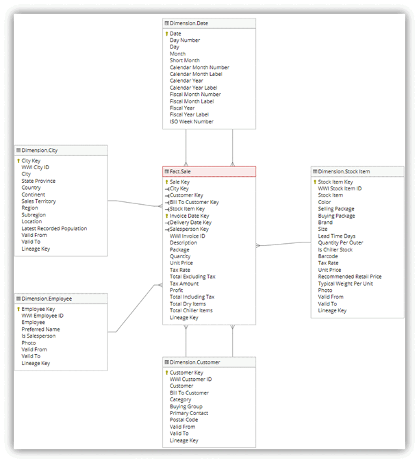 WWI-dimensionsmodellen har flere faktatabeller i et stjerneskema. I dette selvstudium fokuserer du på fact_sale tabellen og dens relaterede dimensioner for at demonstrere et komplet data warehouse-scenarie: