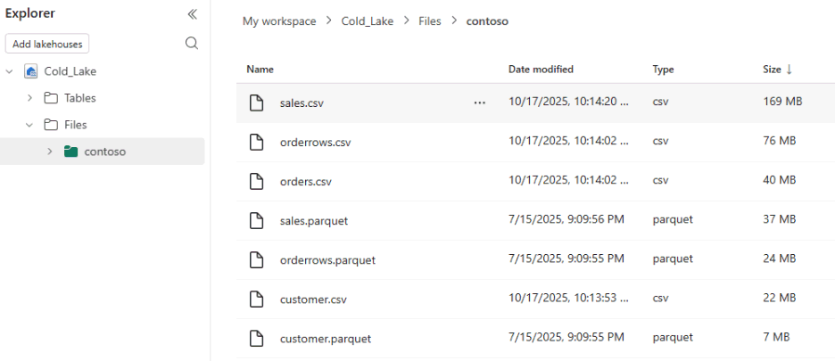 Følgende eksempelscripts bruger et Fabric Lakehouse-navn, Cold_Lake som hoster Contoso-butiks- og kundedata i parquet- og csv-filer.