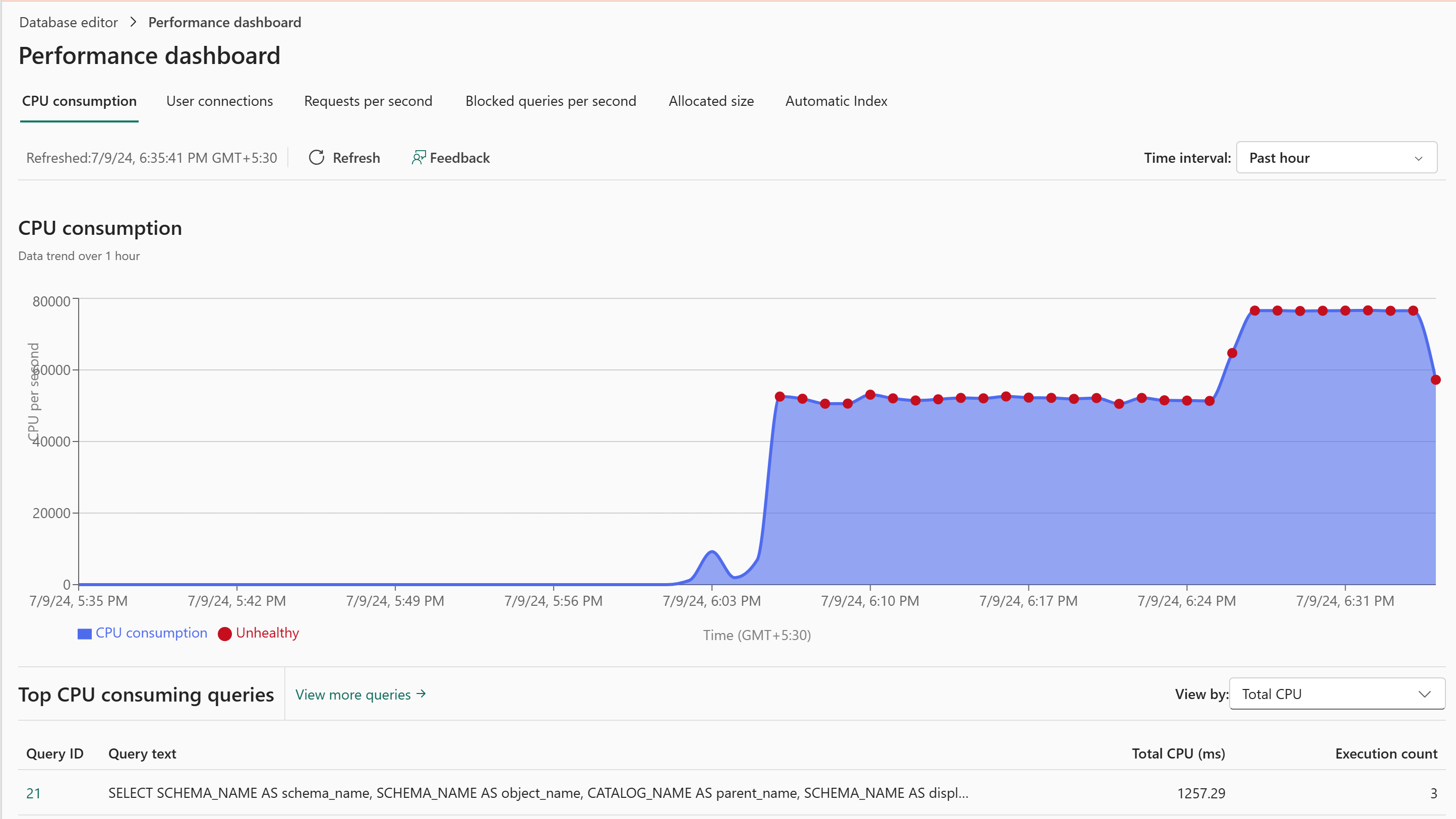 Når databasen når en kritisk tilstand af CPU-forbrug (eller en anden faktor, der udløser en advarsel), kan du se usunde punkter markeret i grafen under fanen CPU-forbrug og markere punkter, hvor CPU-forbruget overskred tærskelværdien. Tidsintervallet kan konfigureres og er som standard 24 timer.