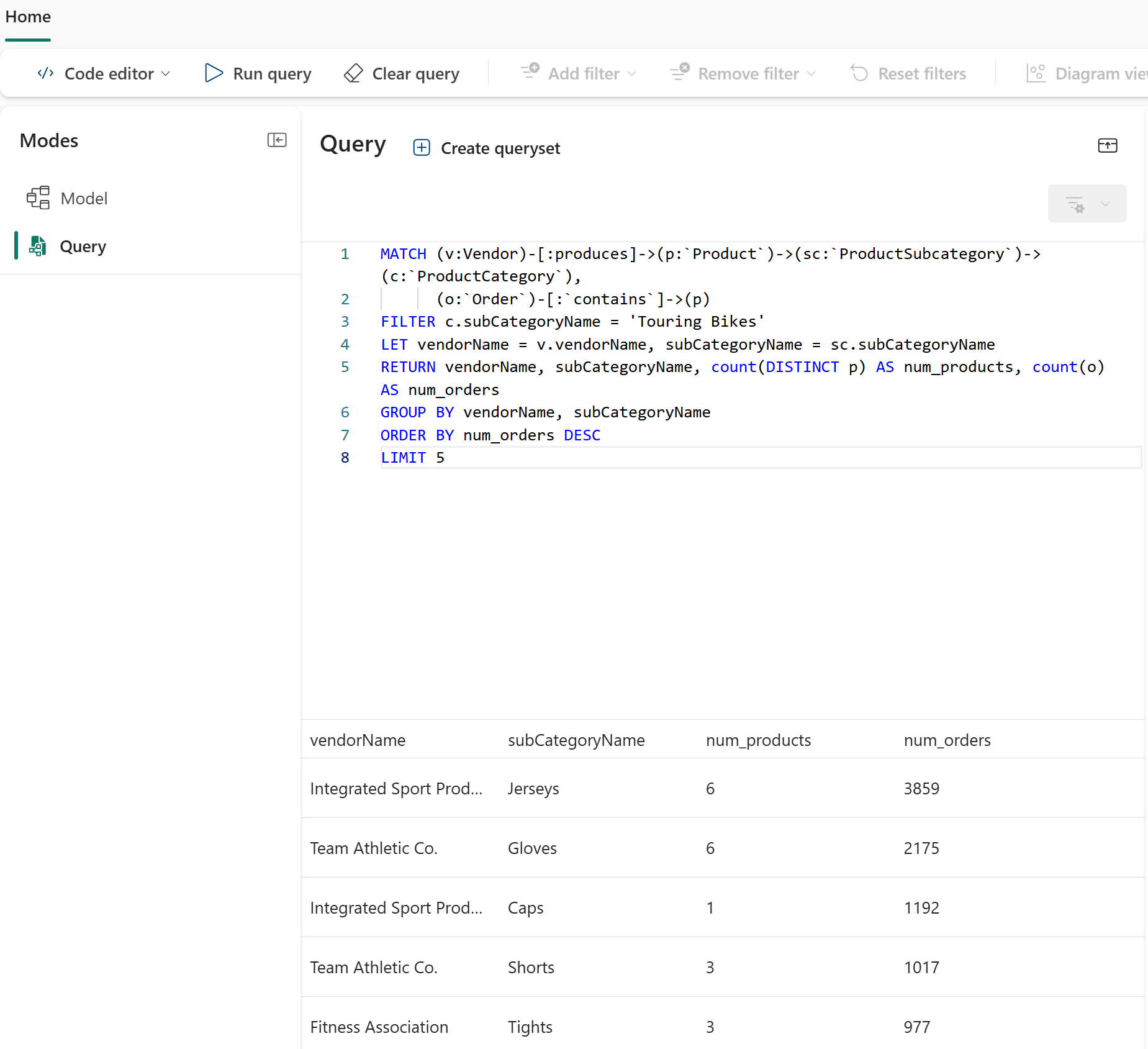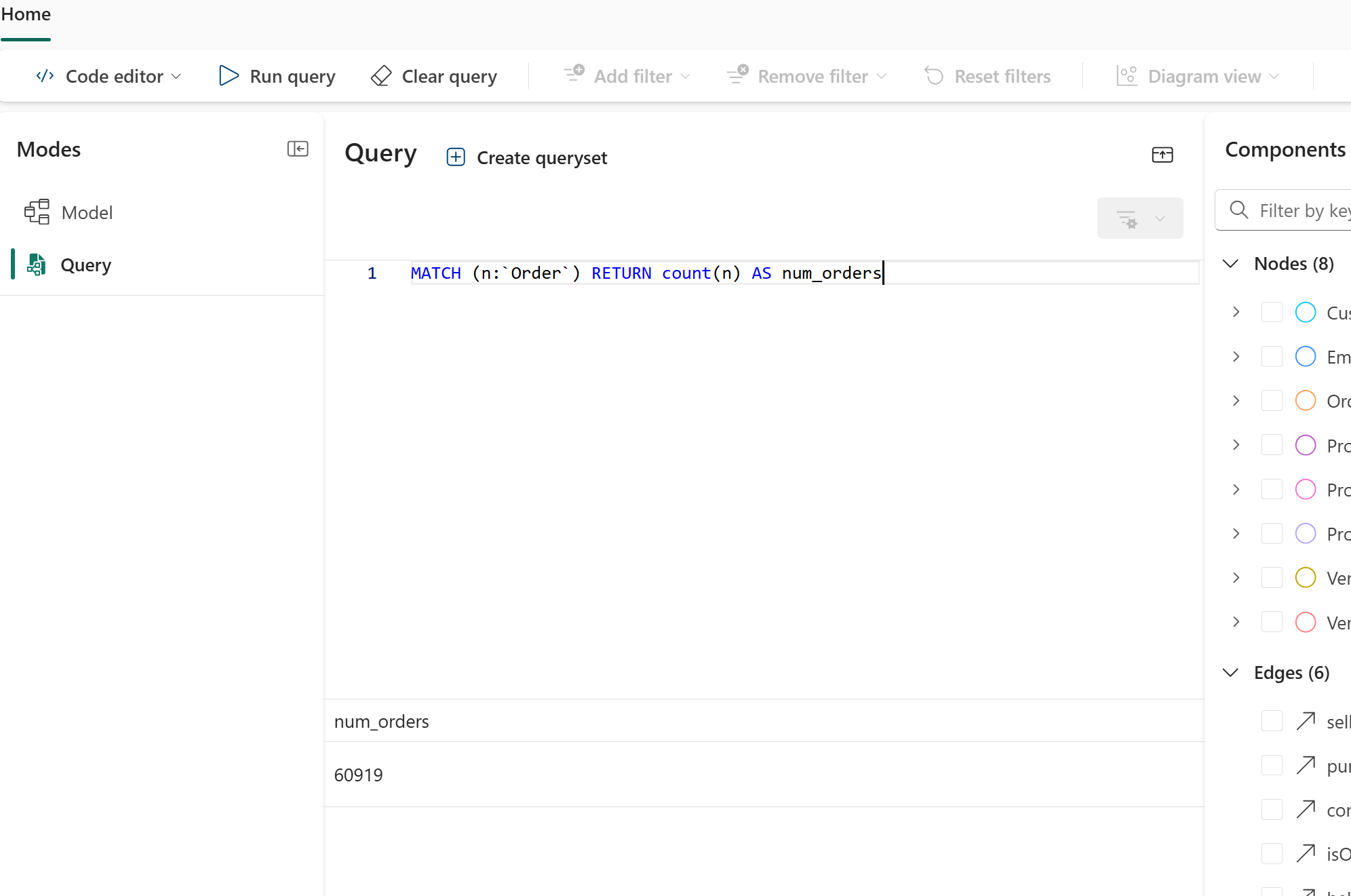 MATCH (n:`Order`) RETURN count(n) AS num_ordersVælg Kør forespørgsel for at udføre forespørgslen.