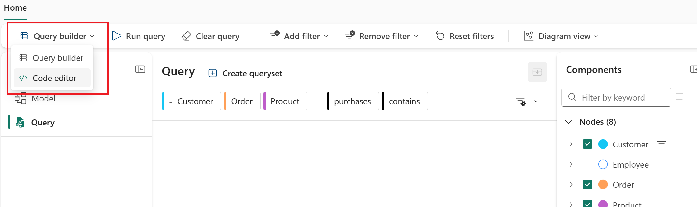 I dette vejledningstrin forespørger du din graf ved at bruge GQL (Graph Query Language) i kodeeditoren. GQL tilbyder kraftfulde forespørgselsmuligheder for komplekse grafmønstre og analyser.