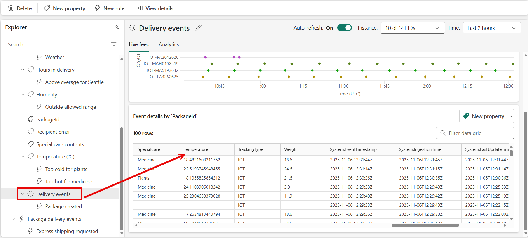 Vælg objektet Leveringshændelser i ruden Stifinder. Du kan oprette regler om objekter, der bruger data fra hændelsesstrømmen Pakkeleveringshændelser . Det kan f.eks. være en regel, der kontrollerer pakker for temperatur.