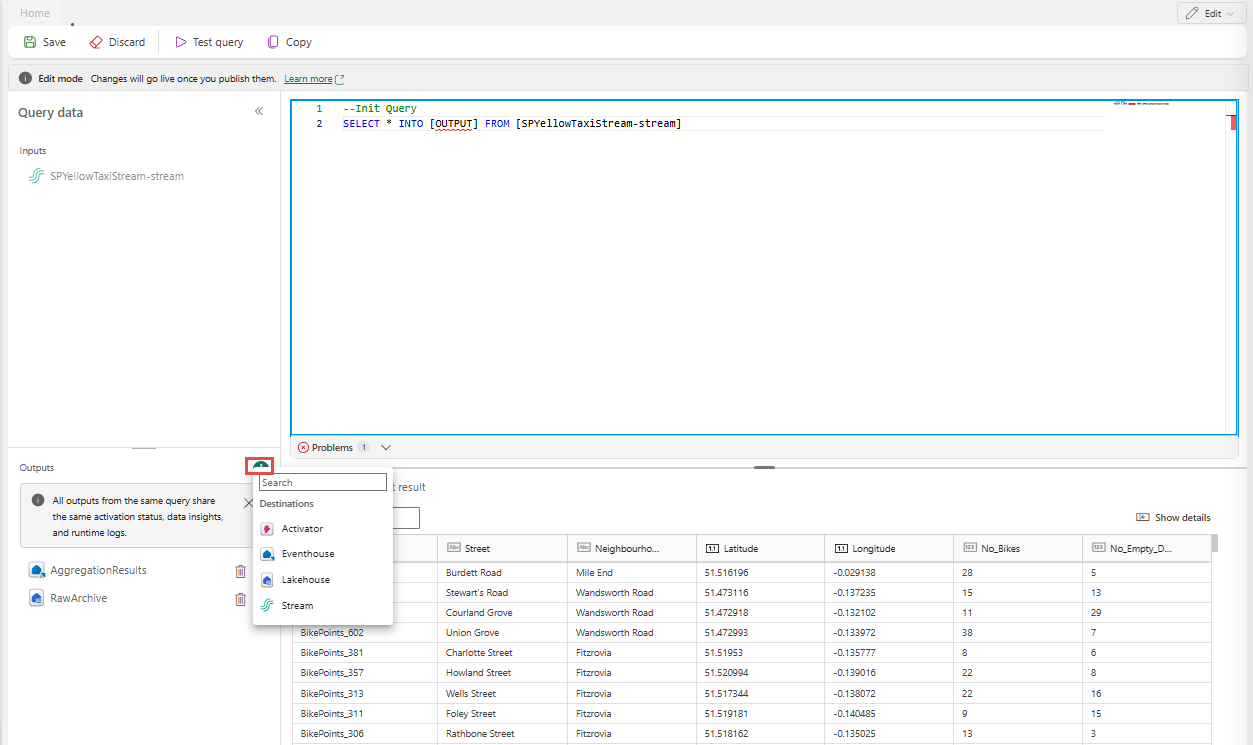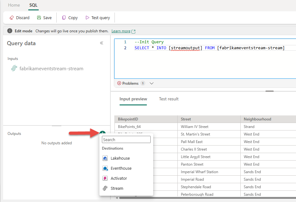 --Base query: Reading input stream once With InputStream AS( SELECT * FROM [SQLDemoES-stream] ) -- Query 1: Archive all data to Lakehouse SELECT * INTO [RawArchive] FROM InputStream -- Query 2: Aggregate and filter data to create a real time dashboard to an Eventhouse SELECT System.Timestamp() AS EventTime, COUNT(*) AS EventCount INTO [AggregationResults] FROM InputStream GROUP BY TumblingWindow(minute, 1) HAVING COUNT(*) > 100Vælg Testforespørgsel for at validere forespørgselsresultatet. Hvert output, der er defineret i forespørgslen, har en separat fane i testresultatpanelet .