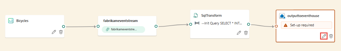 Der føjes en ny SQL-node til din eventstream. Vælg blyantikonet for at fortsætte med at konfigurere SQL-operatoren.