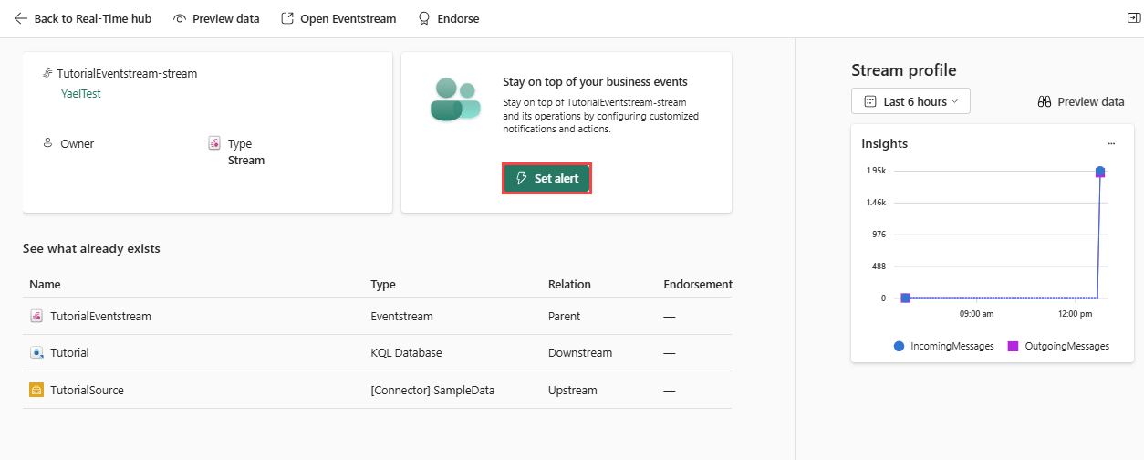 Vælg den TutorialEventstream eventstream, du oprettede i den forrige tutorial. Siden med eventstream-oplysninger åbnes.
