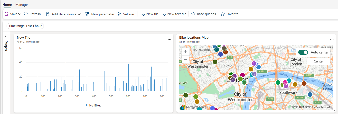 AggregatedData | sort by BikepointID | render columnchart with (ycolumns=No_Bikes,xcolumn=BikepointID)Vælg Gem på dashboard>Nyt Real-Time Dashboard.