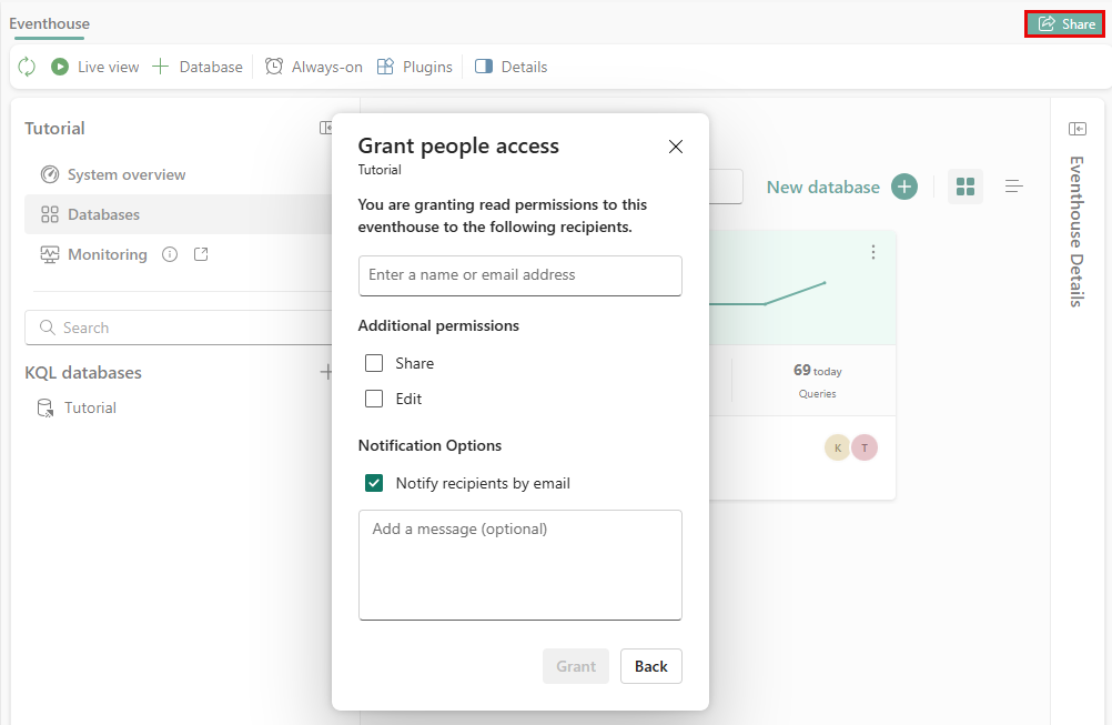 Åbn Tutorial-eventhuset , vælg Databaser, og vælg Del-knappen .
