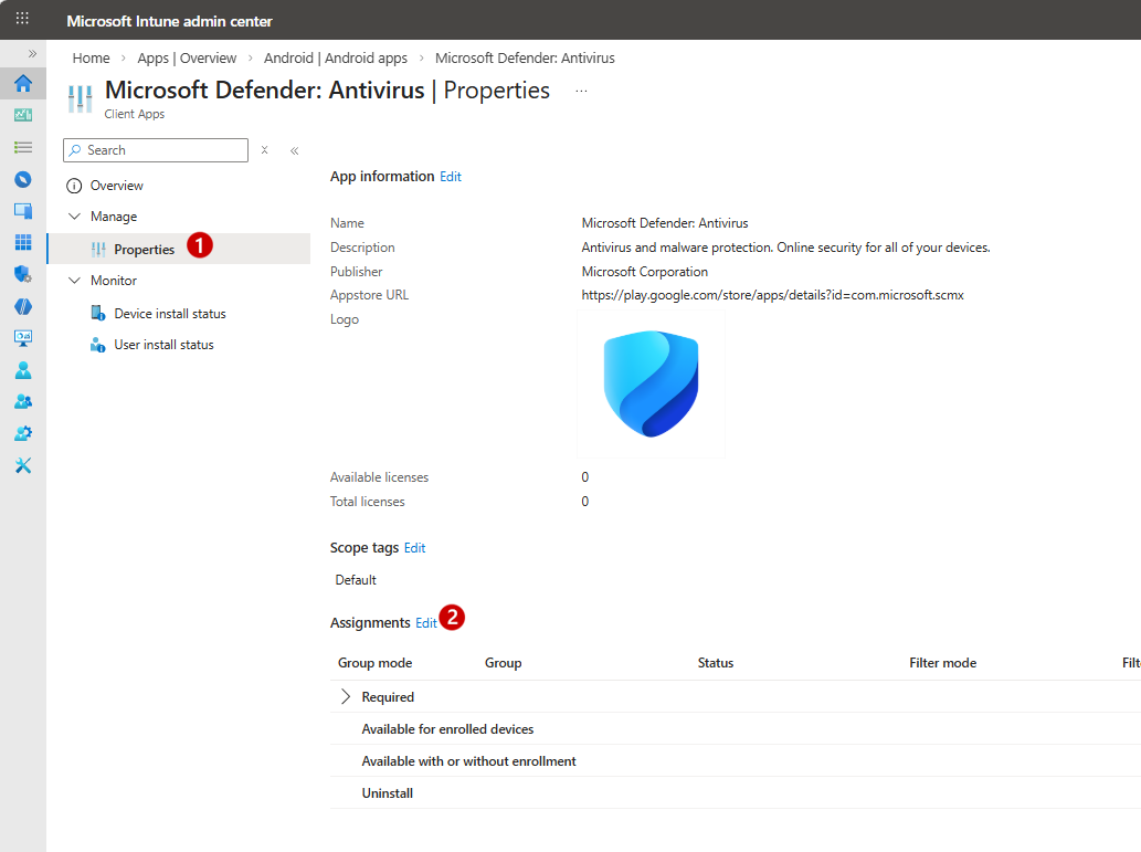 From the Android apps page of the Intune admin center, select Microsoft Defender: Antivirus from the apps list. Go to Properties (1), and for Assignments, select Edit (2).