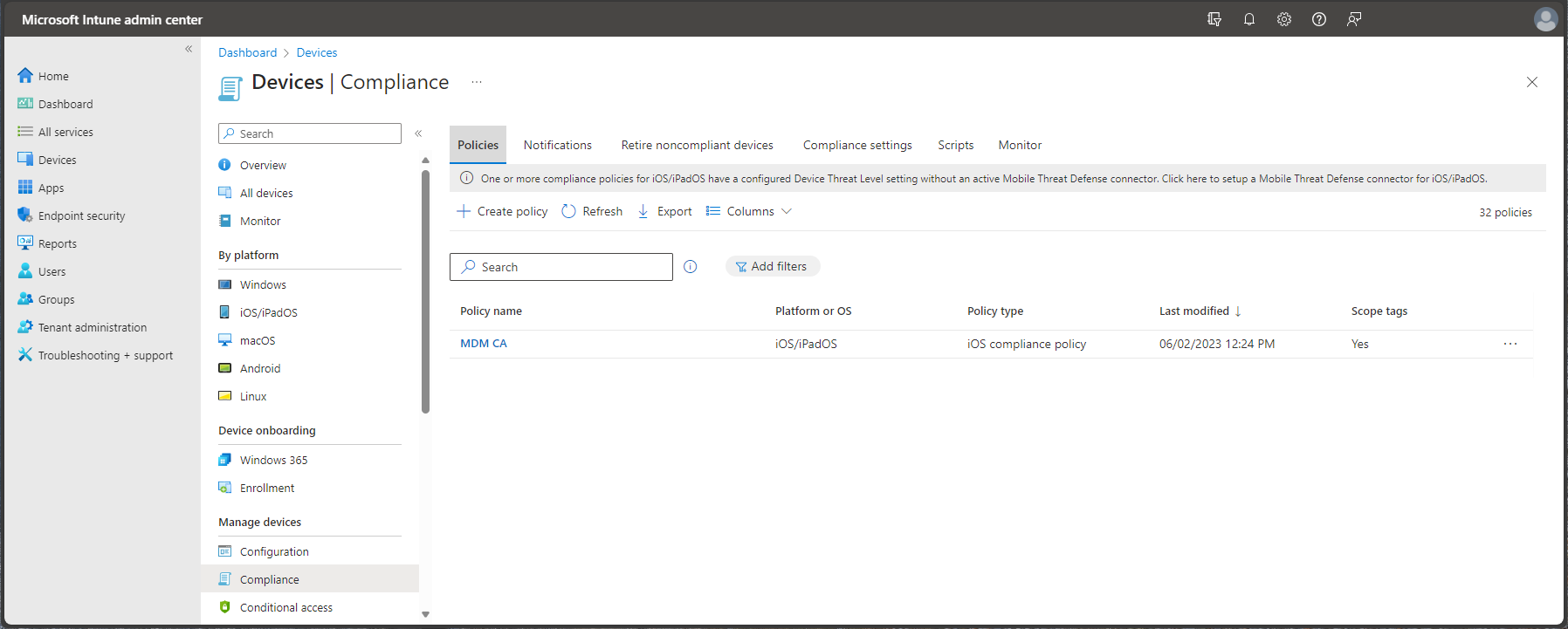 For more information, see Get started with device compliance policies in Intune.