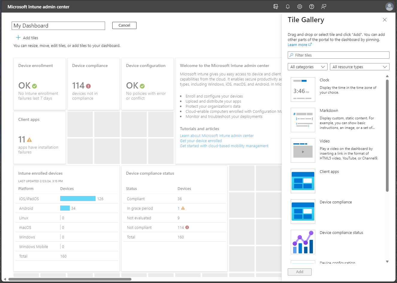 The Dashboard displays overall details about the devices and client apps in your Intune tenant. Dashboards provide a way for you to create a focused and organized view in the Microsoft Intune admin center. Use dashboards as a workspace where you can quickly launch tasks for day-to-day operations and monitor resources. Build custom dashboards based on projects, tasks, or user roles, for example. The Microsoft Intune admin center provides a default dashboard as a starting point. You can edit the default dashboard, create and customize additional dashboards, and publish and share dashboards to make them available to other users.
