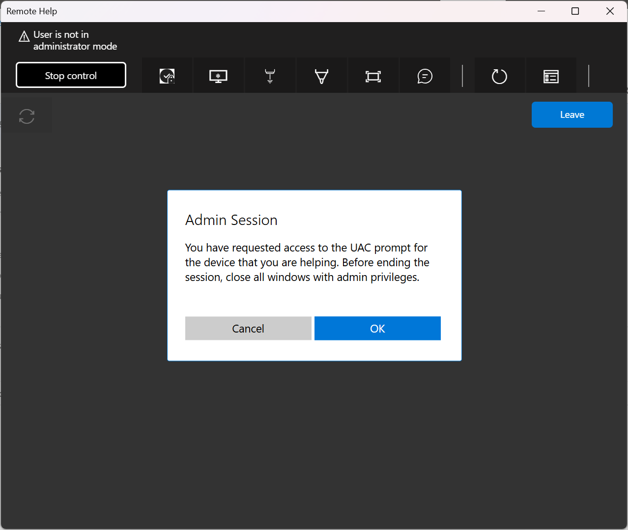 Elevation: Allows helpers to enter UAC credentials when prompted on the sharer's device. Enabling elevation also allows the helper to view and control the sharer's device when the sharer grants the helper access.