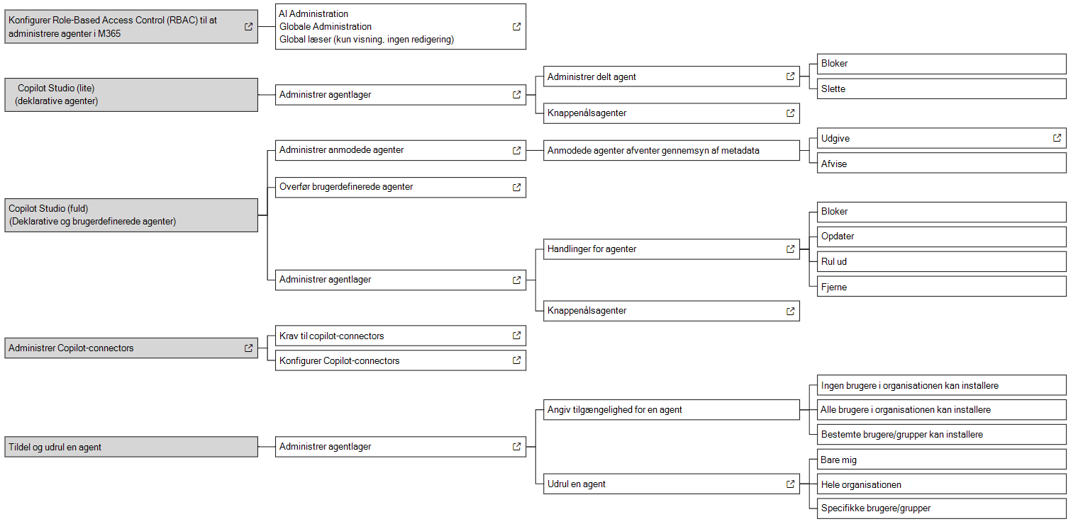 Effektiv styring og sikkerhed er afgørende for administration af copilotagenter på tværs af din virksomhed. Du kan finde flere oplysninger under Tjekliste til udrulning af Microsoft 365 agenter.