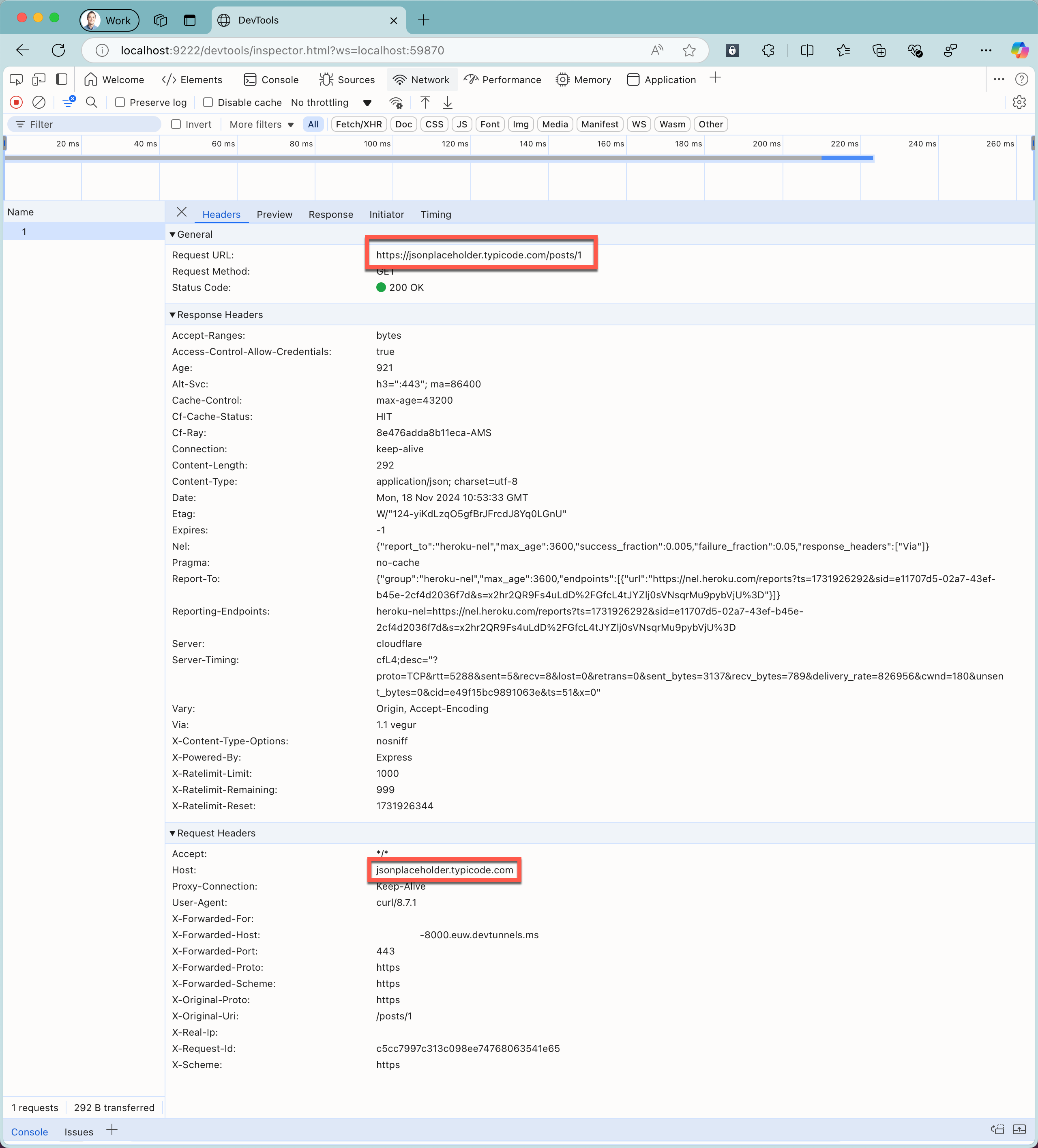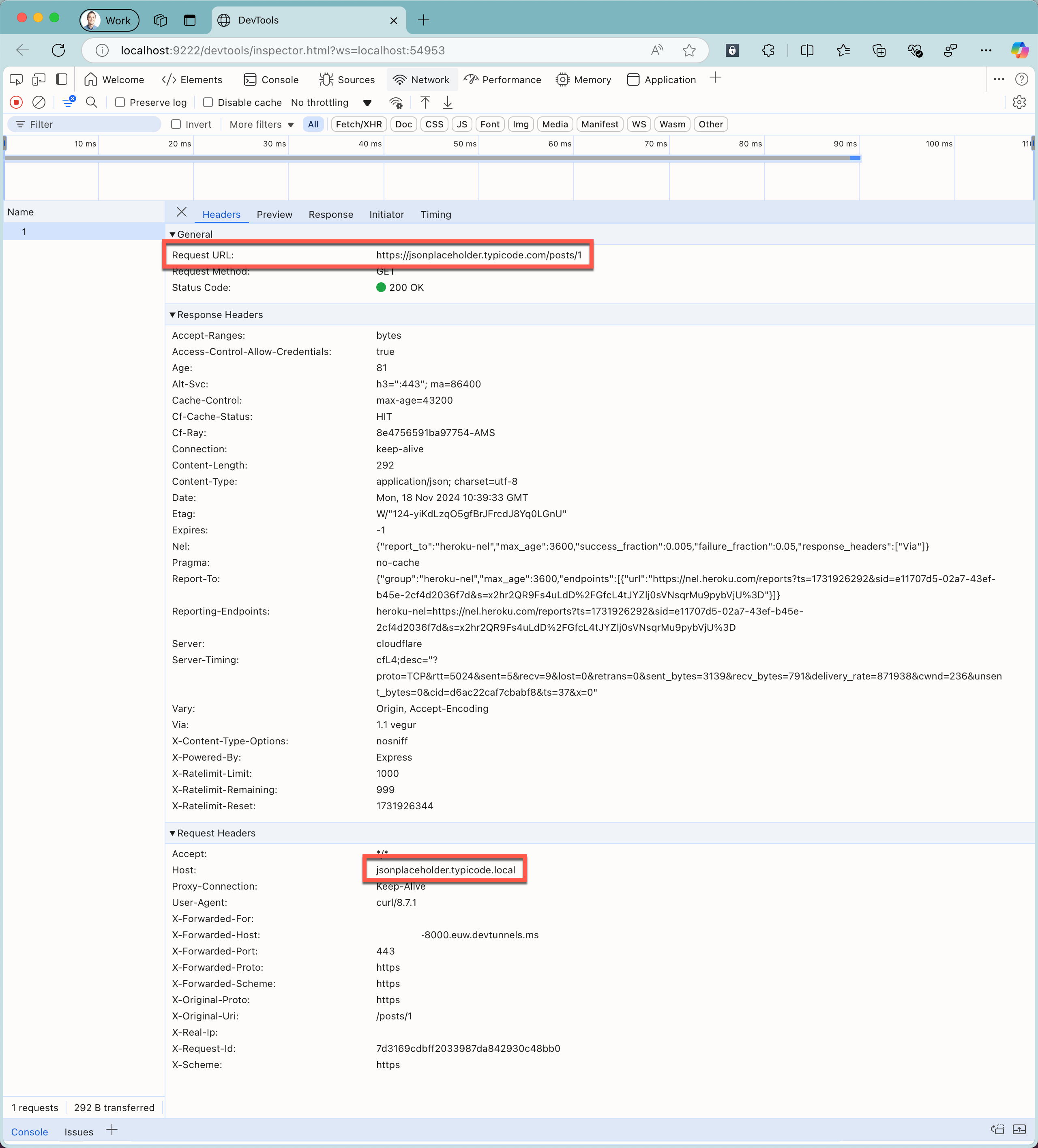 curl https://tunnel_id-8000.euw.devtunnels.ms/posts/1.In the web browser with Chrome Dev Tools, notice the information about the intercepted request and the response from the cloud API.