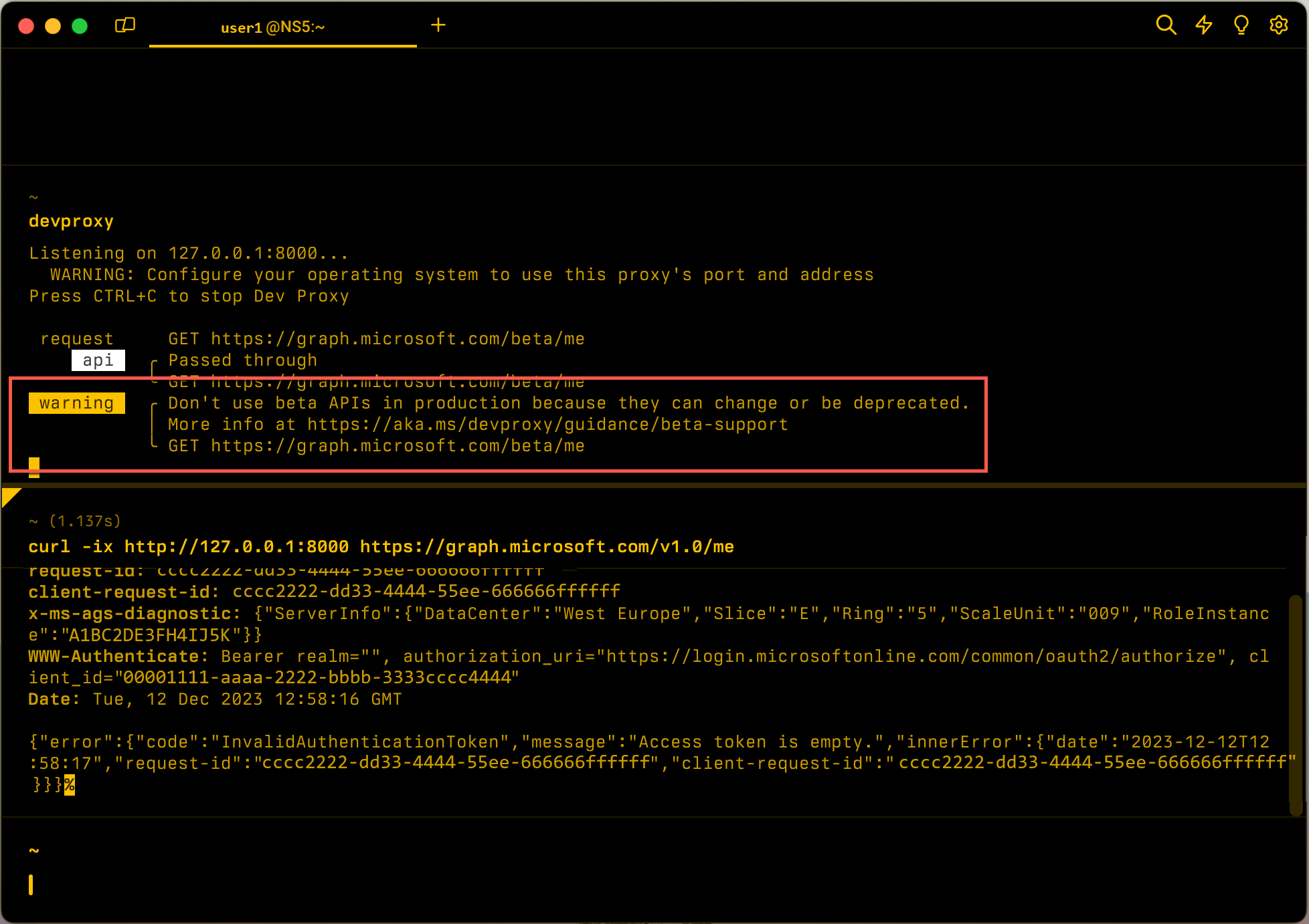 Shows a warning when proxy detects a request to Microsoft Graph beta endpoint.