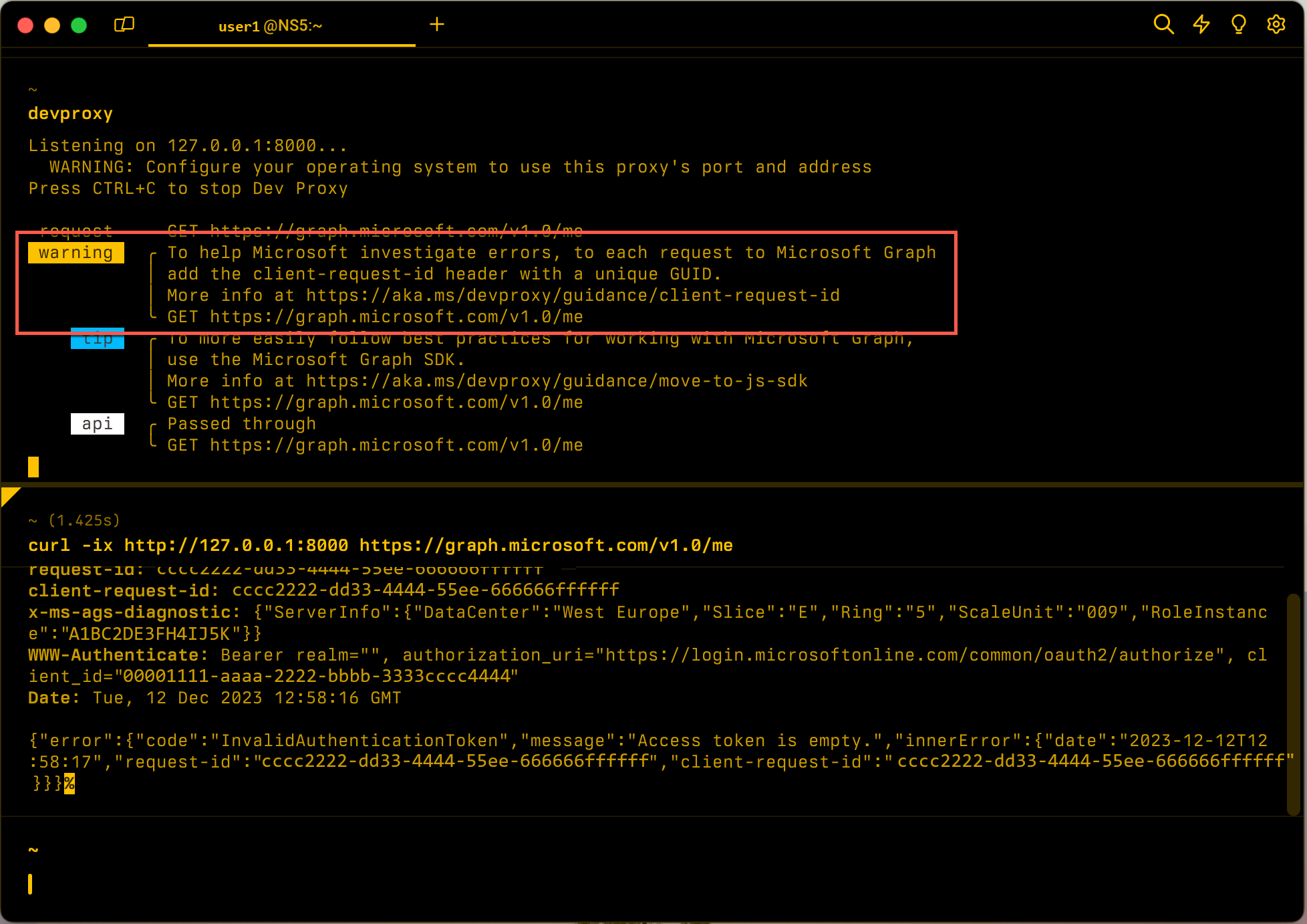 Shows a tip when a request to Microsoft Graph API doesn't include the client-request-id header.