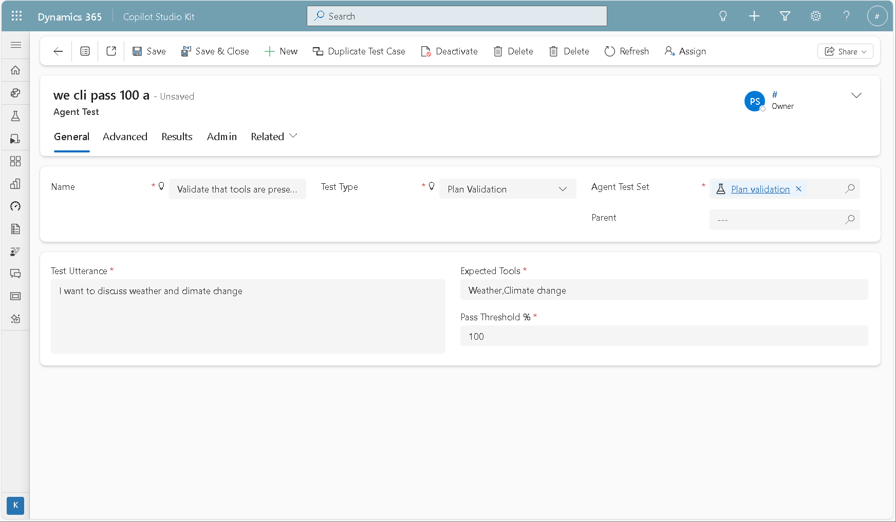 | Forventede værktøjer | Afhænger | Obligatorisk for planvalideringstesttype. Kommasepareret liste over forventede værktøjer (værktøjer, handlinger og forbundne agenter). Tilføj ikke ekstra blanktegn. Ordre er ikke relevant. Eksempel: "Vejr,Klimaændringer" |