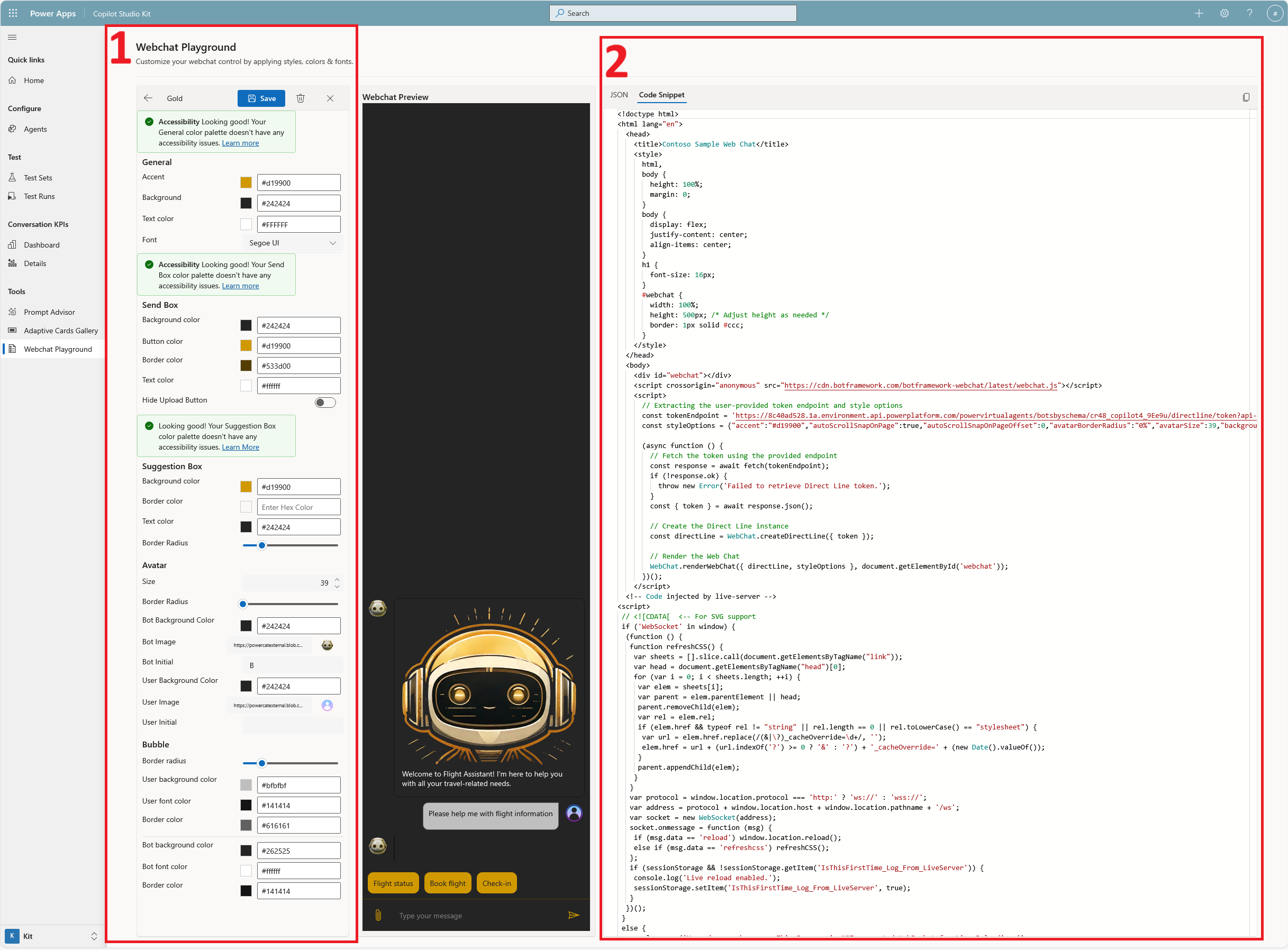 Webchat Playgrounds brugervenlige brugergrænseflade hjælper dig med at definere udseendet og følelsen af din Web Chat. Du kan nemt foretage justeringer og se eksempler på dine ændringer i realtid.