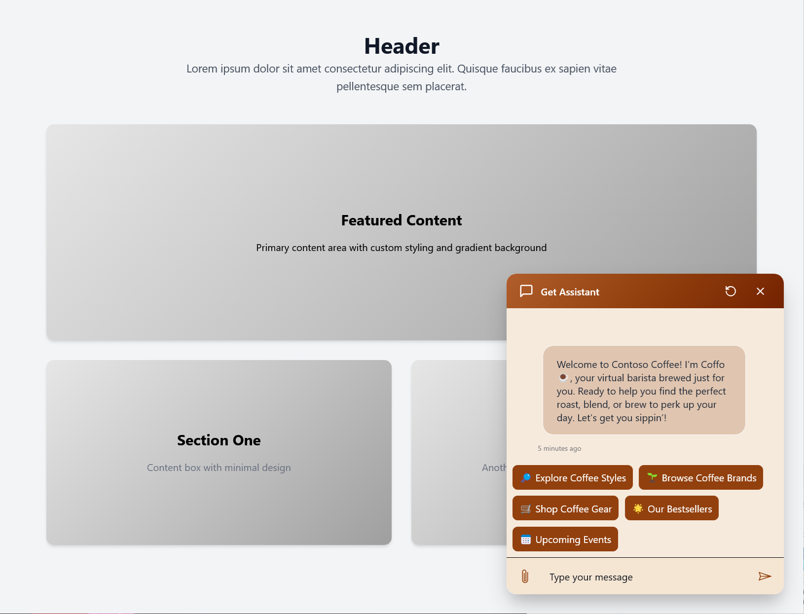 HTML-eksempelstykket indeholder en flydende widget Web Chat kontrolelement med de valgte typografier anvendt.
