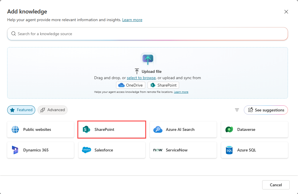 SharePoint som videnskilde fungerer ved at parre agenten med en SharePoint URL-adresse eller SharePoint lister. I denne artikel beskrives den fulde SharePoint integrationsfunktionalitet ved at vælge indstillingen SharePoint i dialogboksen Tilføj viden.