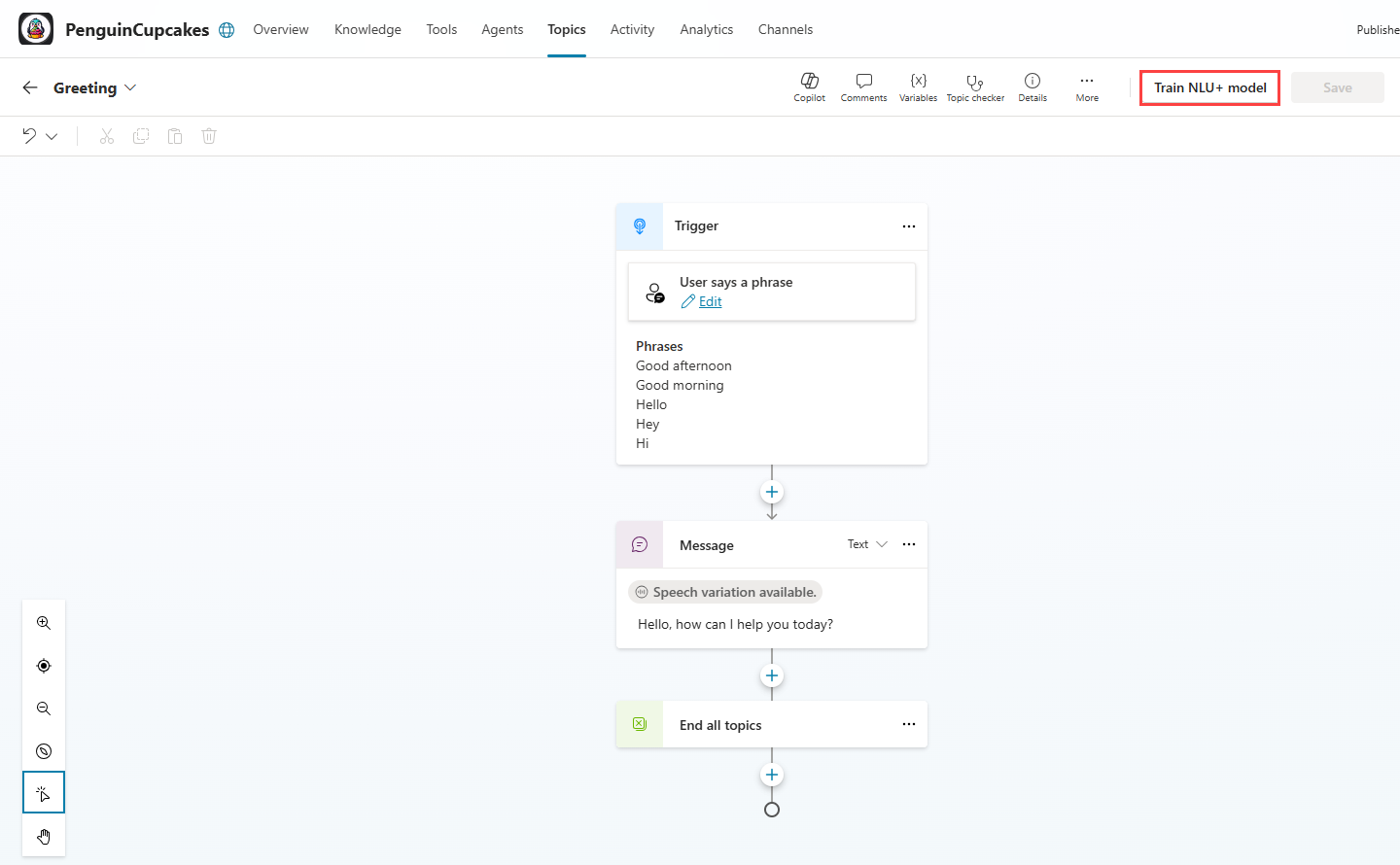- Indstillingen NLU+ er tilgængelig, når du administrerer dine stemme- eller chatkanaler med en Dynamics 365 Contact Center-licens. Du kan få flere oplysninger ved at gå til Systemkrav til Dynamics 365 Contact Center.