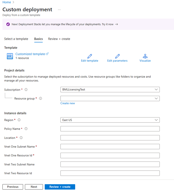 { "$schema": "https://schema.management.azure.com/schemas/2019-04-01/deploymentTemplate.json#", "contentVersion": "1.0.0.0", "parameters": { "policyName": { "type": "string", "metadata": { "description": "The name of the Enterprise Policy." } }, "powerplatformEnvironmentRegion": { "type": "string", "metadata": { "description": "Geography of the PowerPlatform environment." } }, "vNetOneSubnetName": { "type": "string" }, "vNetOneResourceId": { "type": "string", "metadata": { "description": "Fully qualified name, such as /subscription/{subscriptionid}/..." } }, "vNetTwoSubnetName": { "defaultValue": "", "type": "string" }, "vNetTwoResourceId": { "defaultValue": "", "type": "string", "metadata": { "description": "Fully qualified name, such as /subscription/{subscriptionid}/..." } } }, "variables": { "vNetOne": { "id": "[parameters('vNetOneResourceId')]", "subnet": { "name": "[parameters('vNetOneSubnetName')]" } }, "vNetTwo": { "id": "[parameters('vNetTwoResourceId')]", "subnet": { "name": "[parameters('vNetTwoSubnetName')]" } }, "vNetTwoSupplied": "[and(not(empty(parameters('vNetTwoSubnetName'))), not(empty(parameters('vNetTwoResourceId'))))]" }, "resources": [ { "type": "Microsoft.PowerPlatform/enterprisePolicies", "apiVersion": "2020-10-30-preview", "name": "[parameters('policyName')]", "location": "[parameters('powerplatformEnvironmentRegion')]", "kind": "NetworkInjection", "properties": { "networkInjection": { "virtualNetworks": "[if(variables('vNetTwoSupplied'), concat(array(variables('vNetOne')), array(variables('vNetTwo'))), array(variables('vNetOne')))]" } } } ] }Gem skabelonen, og udfyld oplysningerne for at oprette virksomhedspolitikken, som indeholder følgende oplysninger: