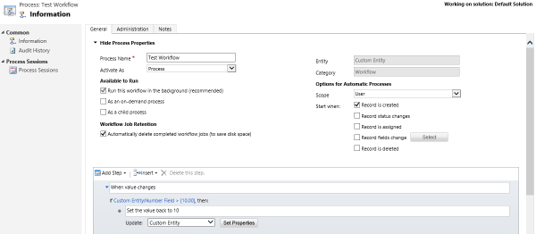 Når du åbner arbejdsprocessen for at se oplysningerne om arbejdsprocessens, skal du finde referencen til den komponent, arbejdsprocessen ikke længere skal være afhængig af. I dette eksempel kan du se feltet Nummerfelt, der refereres til i et procestrin.