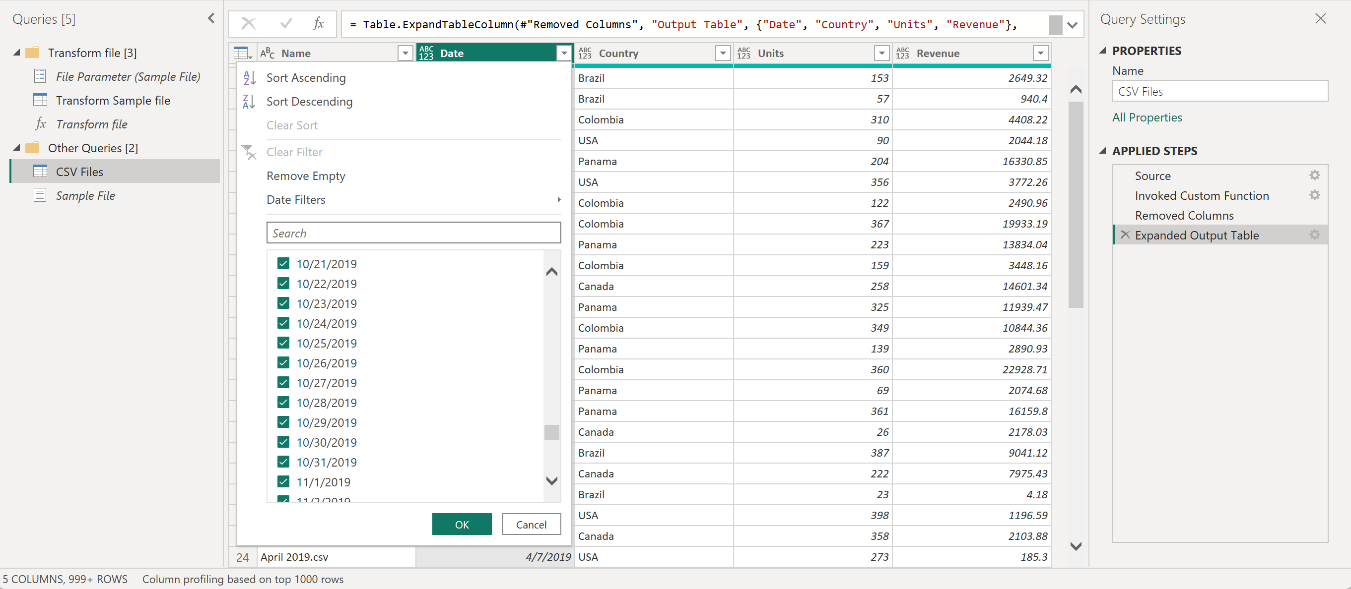 Du kan kontrollere, at du har data fra alle filer i mappen ved at kontrollere værdierne i kolonnen Name eller Date. I dette tilfælde kan du kontrollere værdierne fra kolonnen Dato, da hver fil kun indeholder data for en enkelt måned fra et givet år. Hvis du kan se mere end én, betyder det, at du har kombineret data fra flere filer til en enkelt tabel.