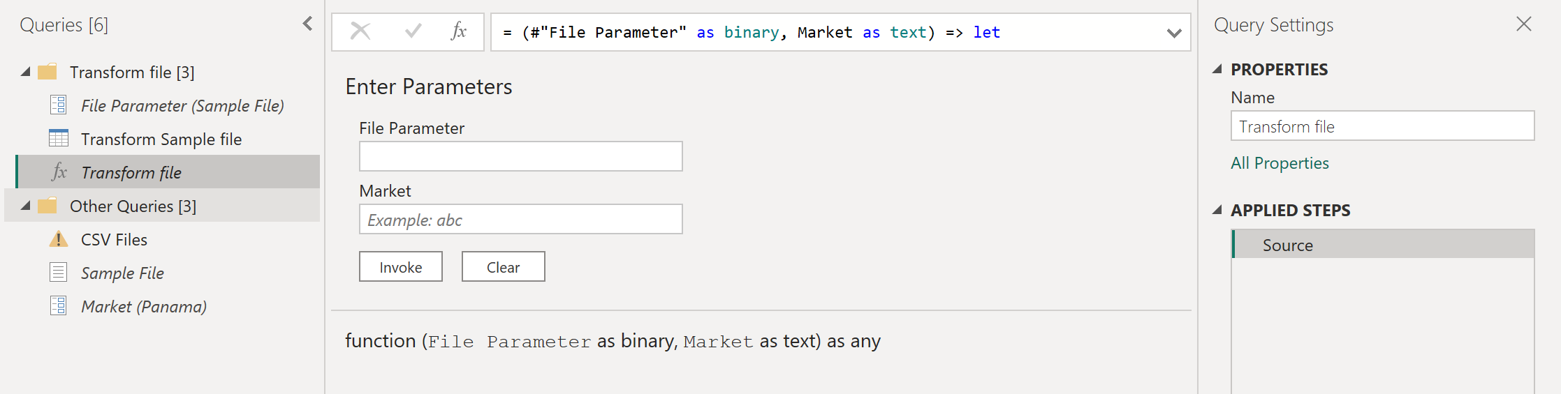 Funktionen transformér fil er afhængig af de trin, der udføres i Transformér eksempelfilen forespørgslen. Men hvis du forsøger manuelt at ændre koden for transformér fil funktion, får du vist en advarsel, der læser The definition of the function 'Transform file' is updated whenever query 'Transform Sample file' is updated. However, updates will stop if you directly modify function 'Transform file'.