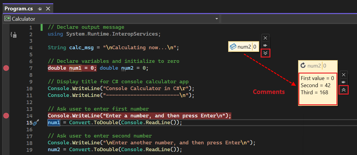 To close the Comments region, use the double Up arrow to Collapse comments. Any comments you enter remain with the data tip, but they're not currently visible.