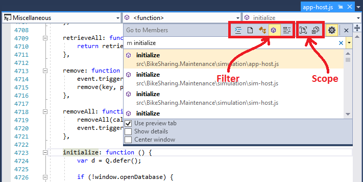 By default, the specified item is searched for among all solution items. However, you can limit your code search to specific element types by prefacing the search terms with certain characters. You can also quickly change the search filter by selecting buttons on the toolbar of the Go To dialog. Buttons that change the type filters are on the left side, and buttons that change the scope of the search are on the right side: