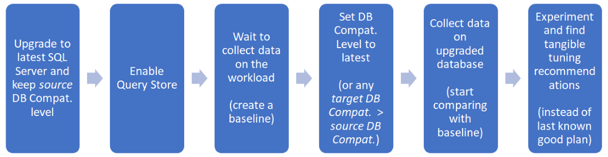 This gating capability provided by the database compatibility level, in combination with Query Store gives you a great level of control over the query performance in the upgrade process if the upgrade follows the recommended workflow seen in the next diagram. For more information on the recommended workflow for upgrading the compatibility level, see Change the database compatibility level and use the Query Store.