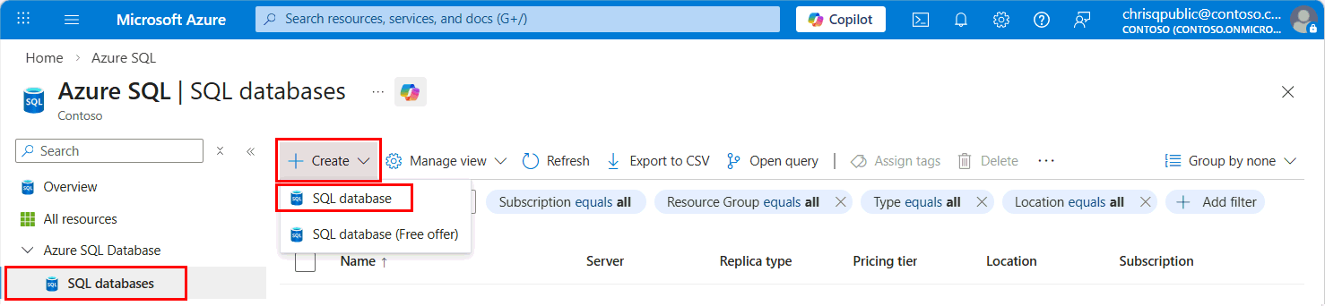 Select the + Create dropdown button and select SQL database.