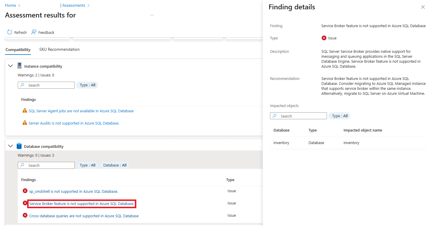 The Compatibility tab shows information on all the issues and warnings that were found as part of the assessment. For each finding, select the Findings hyperlink to get information about the finding, with remediation recommendations and a list of affected objects.