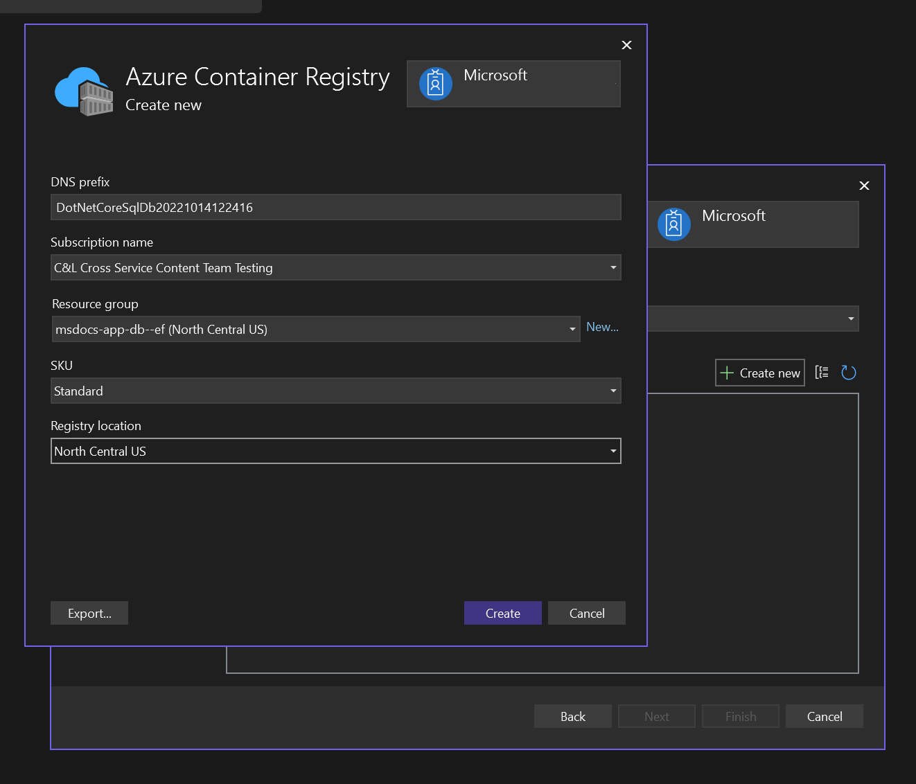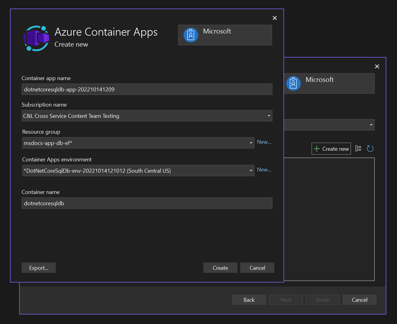 - Select Create to close the original container apps dialog. Visual Studio creates the container app resource in Azure.
