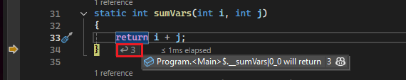 In .NET and C++ code, Visual Studio displays the evaluation result inline for the following: if statements, loops, and function parameter values.