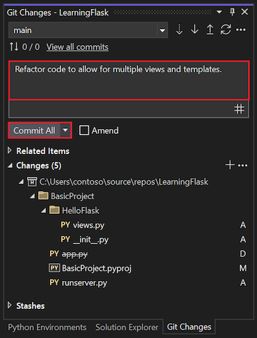 4. You can commit your changes to source control and update your remote repository. For more information, see Commit changes to source control.