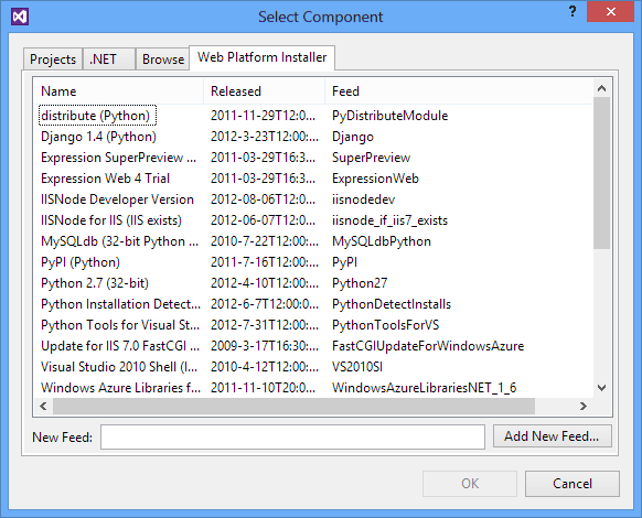 You can add references to Web Platform Installer (WebPI) product entries for deployment to Microsoft Azure Cloud Services where you can install more components via the WebPI feed. By default, the feed displayed is Python-specific and includes Django, CPython, and other core components. You can also select your own feed as shown in the following image. When you publish to Microsoft Azure, a setup task installs all of the referenced products.