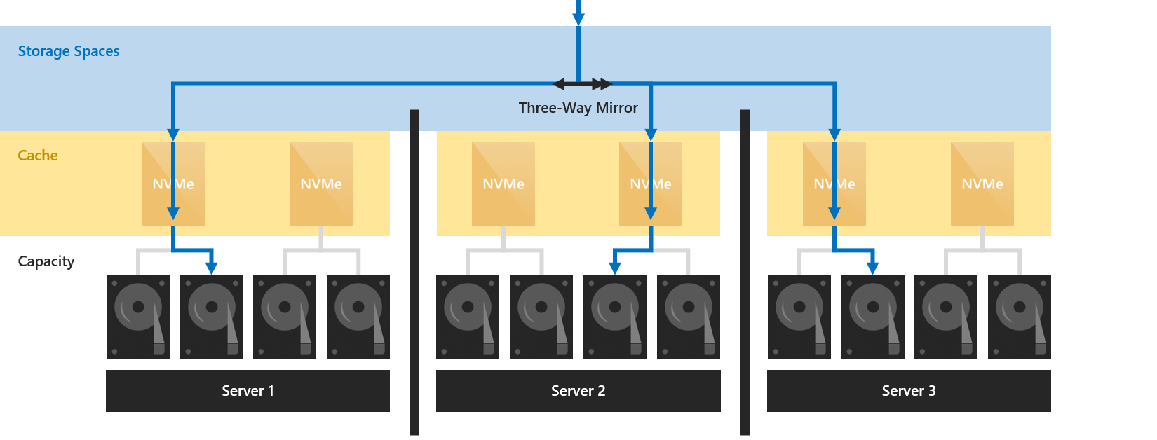 For example, when using three-way mirroring, three copies of any data are written to different servers, where they land in cache. Regardless of whether they're later destaged or not, three copies always exist.