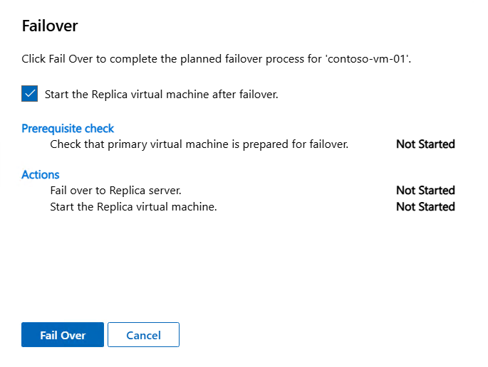 In the pane that opens, review the summary of the planned failover, then select Fail Over. The failover process begins and the replication state is Prepared for planned failover. If you want to cancel the planned failover at this point, select Cancel Planned Failover.