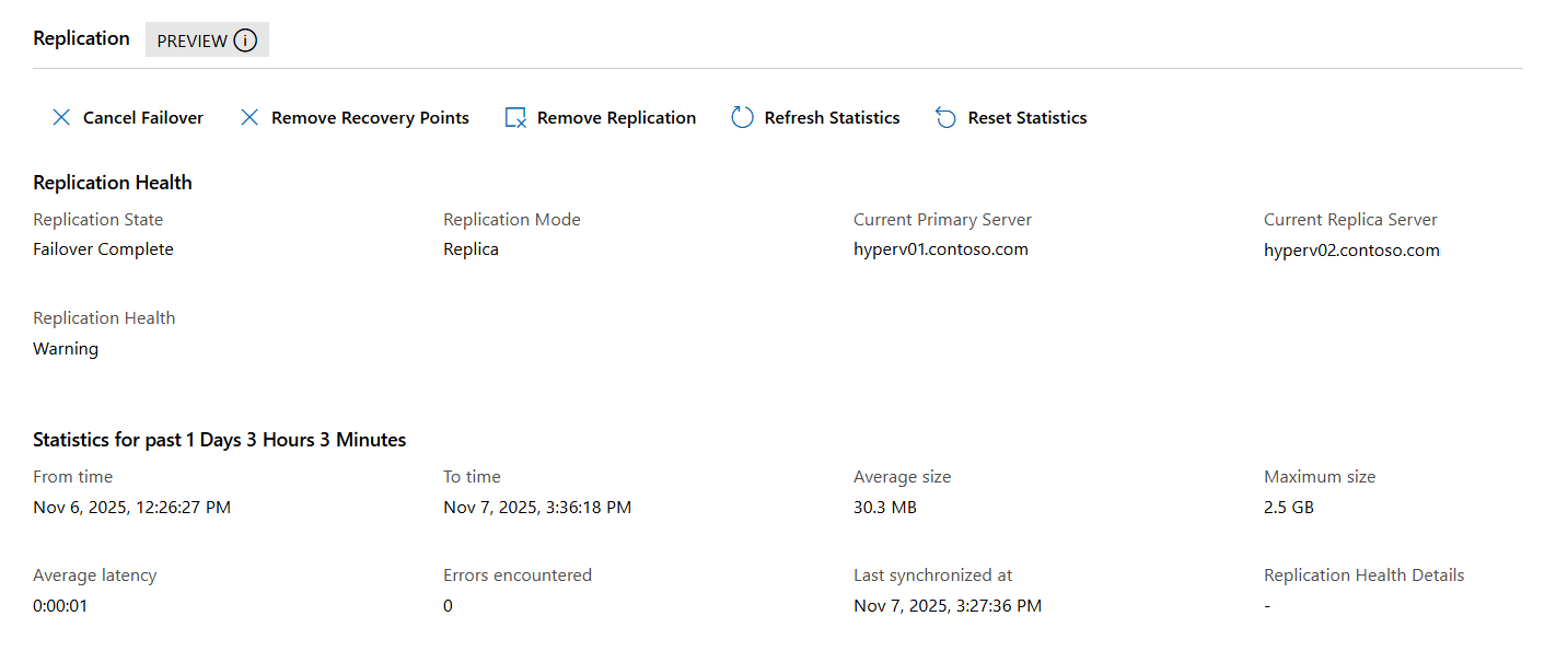 At this point failover is complete, however the replication health shows as Warning because that replication direction isn't configured. Reverse replication using Windows Admin Center - Virtualization mode isn't available at this time. Use Hyper-V Manager or PowerShell to perform reverse replication.