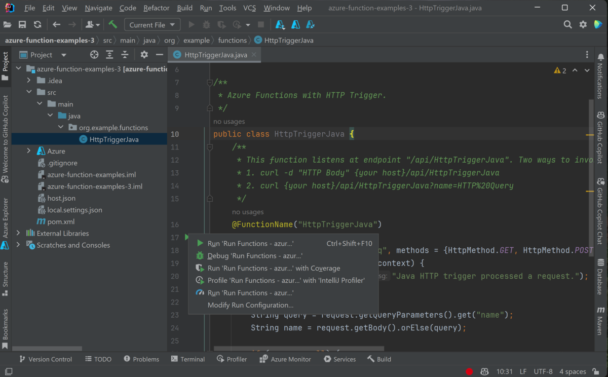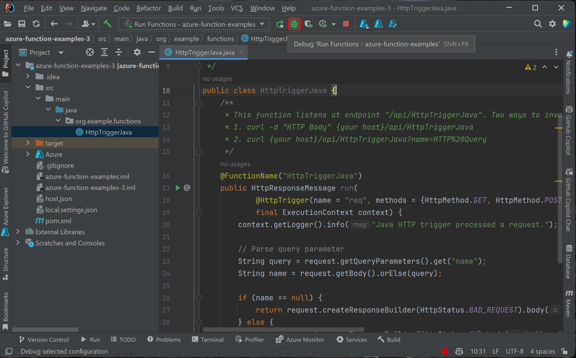 Wählen Sie HTTP-Trigger aus, wählen Sie Weiter, und gehen Sie im Assistenten alle Konfigurationen auf den nachfolgenden Seiten durch. Bestätigen Sie den Projektspeicherort, und wählen Sie dann Fertig stellen aus. Ihr neues Projekt wird anschließend in IntelliJ IDEA geöffnet.