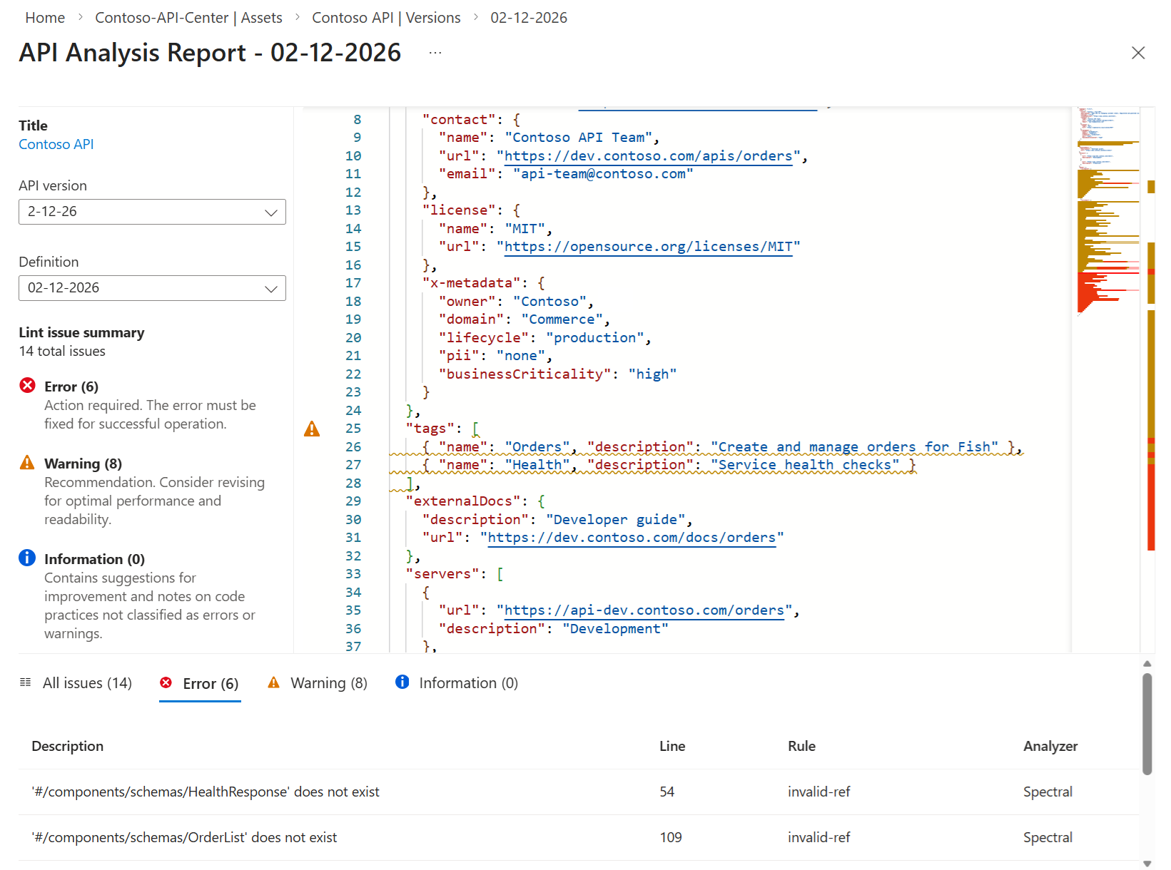 Zeigen Sie eine Analysezusammenfassung und die Analyseberichte für Ihre API-Definitionen im Azure-Portal an. Nach der Analyse der API-Definitionen werden in den Berichten Fehler, Warnungen und Informationen basierend auf dem konfigurierten API-Styleguide aufgelistet.